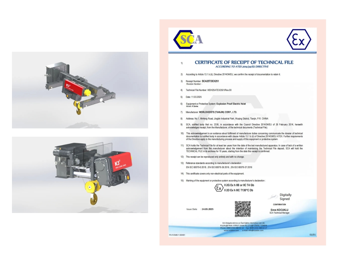 ATEX认证不仅是欧盟市场的准入标准,更被中东、东南亚等地区广泛采信。这一认证的获得,将助力球速体育起重机快速进入欧洲化工、石油、制药等高附加值行业,为全球客户提供更安全、更可靠的起重解决方案。