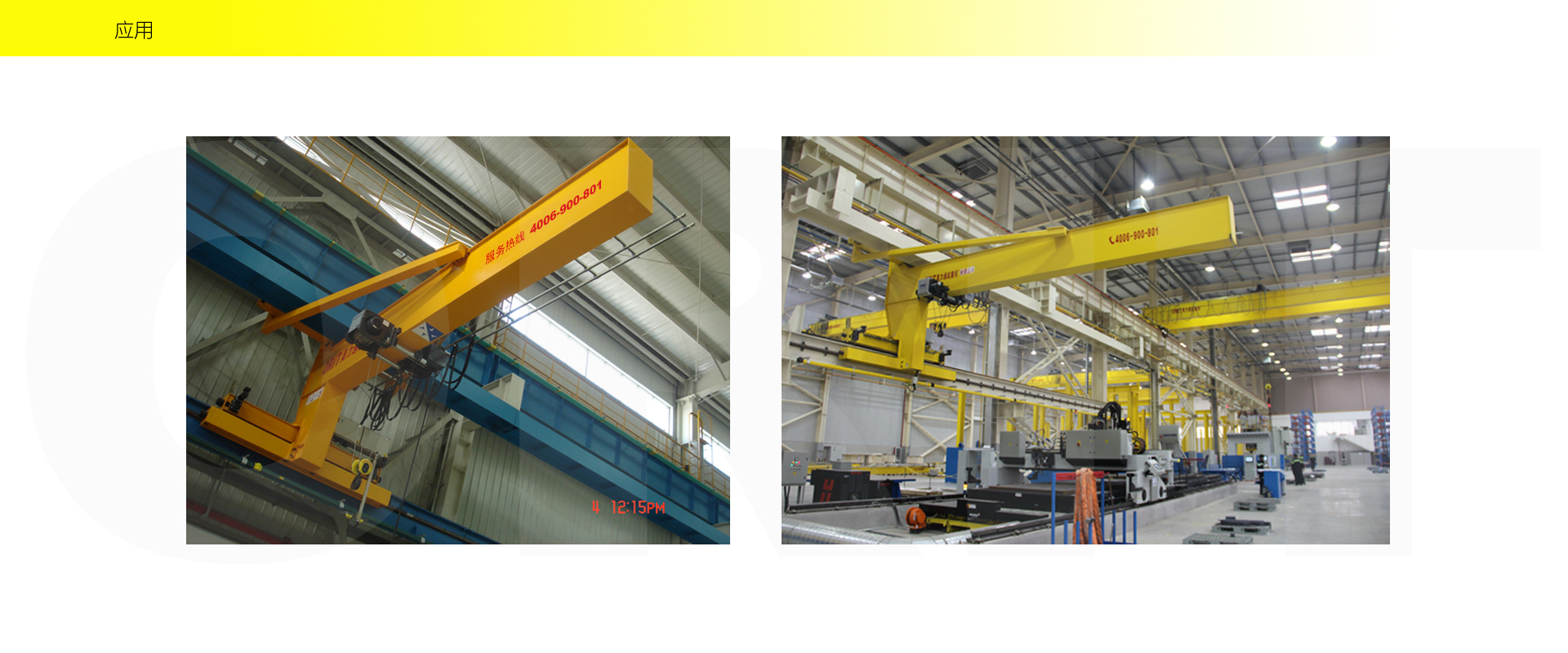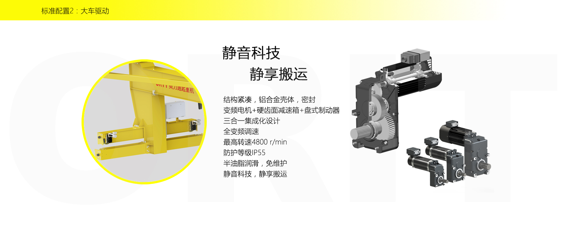 产品名称:壁行式起重机 多层车间的最佳选择 优化设计,结构紧凑 变频控制,运行平稳 实时安全监控,确保吊运安全 占用空间小,工作面积大 集高强度低架构与一体,达到最大的提升设计 适用于5t以下额定载荷平稳、快速地起吊搬运。 标准配置1:起升机构 颠覆传统,自成一体 低净空设计 柔性驱动,内应力小,传动效率高 重级制电机,接电持续率60%ED 行走变频无极调速,运行平稳 自调试电磁盘式制动器,可靠,防尘 2160N/mm² 高强度镀锌钢丝绳,免维护 全周型导绳器,防松绳 全系标配安全监控系统 标准配置2:三合一驱动 静音科技,静享搬运 结构紧凑,铝合金壳体,密封 变频电机+硬齿面减速箱+盘式制动器 龙门专用C型三合一集成化设计,节约空间 全变频调速 最高转速4800 r/min 防护等级IP55 半油脂润滑,免维护 静音科技,静享搬运 标准配置3:电控系统 安全随心掌控 智能安全监控器 计算起升机构剩余安全工作时间 累计起升工作时间 累计超载次数 累计起升电机启动次数 起升电机过热保护及报警 刹车片厚度报警 ... ... 远程通讯 施耐德电气元件 航空插座接口 IP55防护等级 标准配置4:端梁 多变灵活,适应自如 模块化直驱设计 自重轻、体积小 QT700车轮,自润滑,更静音 采用调心轴承,适应更自如 双轮缘端梁与平轮端梁完美结合, 既满足受力要求, 又彻底的解决了三条端梁(轨道)可能产生的啃轨问题。 应用